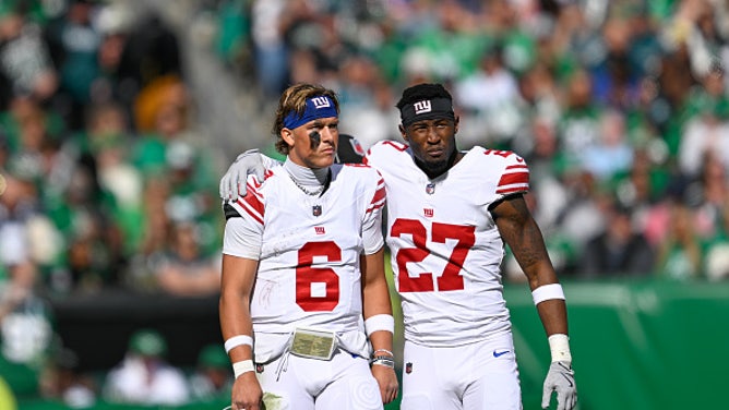 PHILADELPHIA, PA - OCTOBER 26: New York Giants quarterback Jaxson Dart #6 and New York Giants safety Tyler Nubin #27 console each other after New York Giants running back Cam Skattebo #44 is injured during the game between the New York Giants and the Philadelphia Eagles on October 26th, 2025 at Lincoln Financial Field in Philadelphia, PA. (Photo by Terence Lewis/Icon Sportswire via Getty Images)