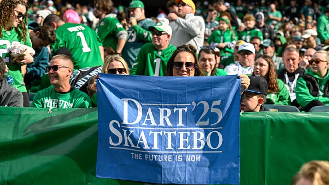 PHILADELPHIA, PA - OCTOBER 26: A fan holds up a sign for New York Giants quarterback Jaxson Dart #6 and New York Giants running back Cam Skattebo #44 during the game between the New York Giants and the Philadelphia Eagles on October 26th, 2025 at Lincoln Financial Field in Philadelphia, PA. (Photo by Terence Lewis/Icon Sportswire via Getty Images)