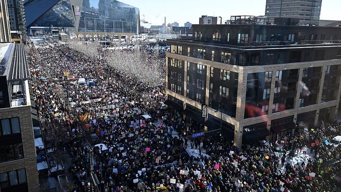 Demonstrators participate in a rally and march during an "ICE Out" day of protest on January 23, 2026 in Minneapolis, Minnesota. Community leaders, faith leaders and labor unions urged Minnesotans to participate in what they are calling a "day of action."