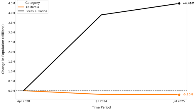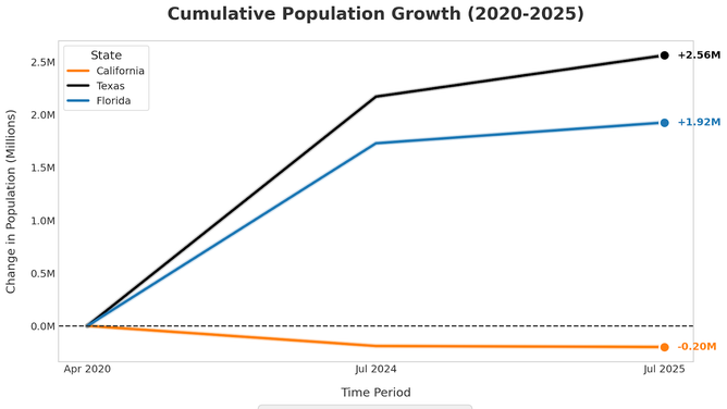 Even as the population of the United States has grown in the last five-plus years, California has shrunk. Remarkably, there are now roughly 200,000 fewer people in CA than there were in 2020. On the other hand, the other two largest states in the country, Texas and Florida, have seen explosive population growth. Texas gained nearly 2.6 million residents over the last five years, while Florida added nearly two million.