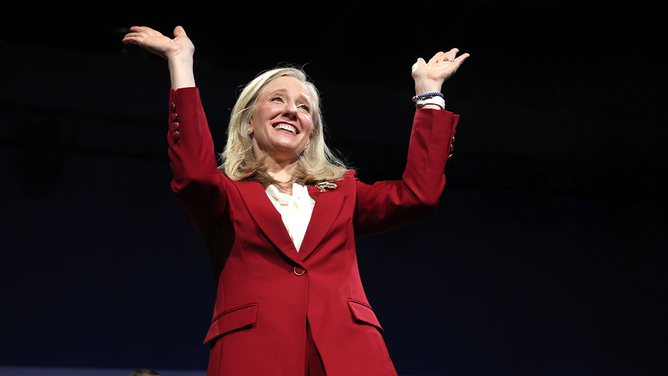 <strong>Virginia Democrat governor-elect, former Rep. Abigail Spanberger celebrates as she takes the stage during her election night rally at the Greater Richmond Convention Center on Nov. 4, 2025. (Win McNamee/Getty Images)</strong>