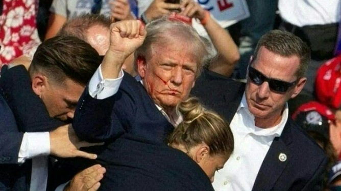 <strong>Republican presidential candidate Donald Trump is seen with blood on his face surrounded by Secret Service agents as he is taken off the stage at a campaign event at Butler Farm Show Inc. in Butler, Pennsylvania, July 13, 2024. (Getty Images/Rebecca Droke)</strong>