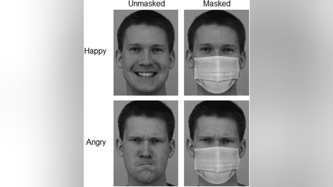 They used photographs of male and female faces with happy or angry expressions, then modified them by overlaying a surgical mask.