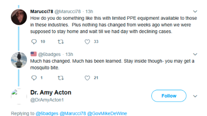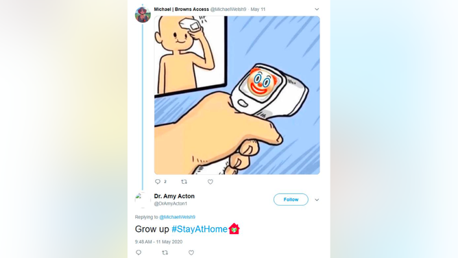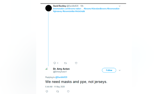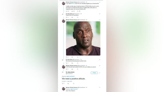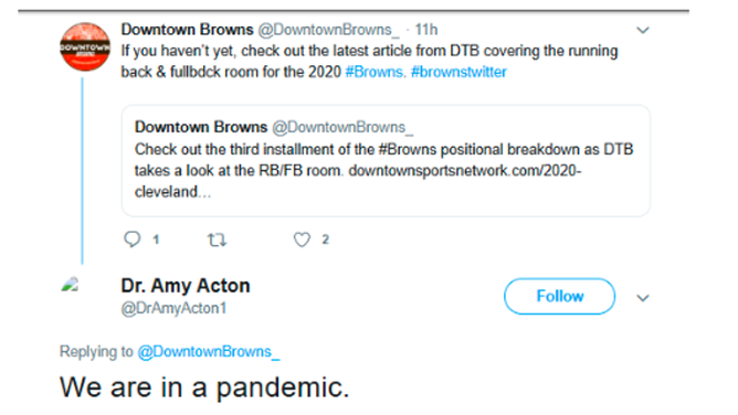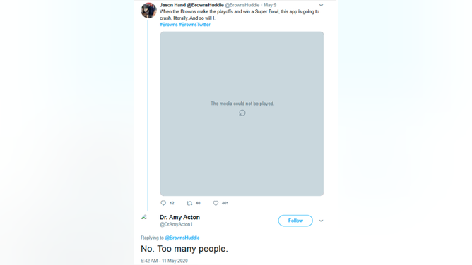 OutKick exclusively obtained a series of social media posts that appear to be made by Dr. Acton's Twitter account in May 2020, engaging primarily with fans of the Cleveland Browns. These posts, which have since been deleted, highlight Acton's comical level of commitment to pointless COVID restrictions.