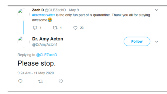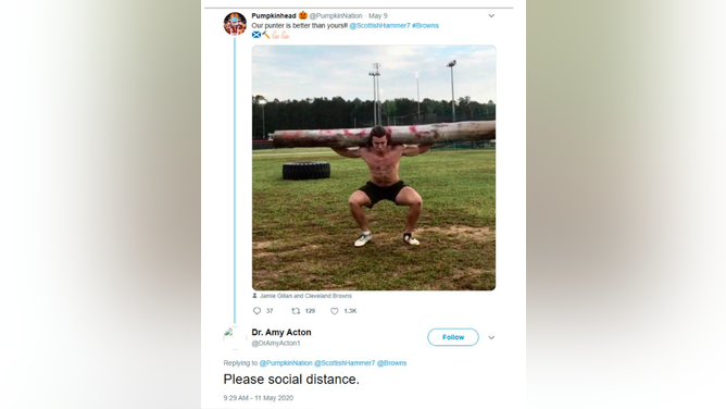 Another post was simply a photo of the Browns punter lifting a log, to which she added, again, "Please social distance." One fan responded to that Browns Twitter was the only "fun part of quarantine." This was apparently too much for Acton, who responded with "Please stop." Some other fan discussion was interrupted with Acton adding "We are in a pandemic."