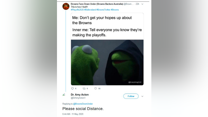 In one example, she responded to a Browns fan posting a Kermit meme about their hopes for the team to make the playoffs by saying, "Please social distance." In another, a Browns fan posted about Baker Mayfield as the team's quarterback, only for Acton to respond with "Please follow CDC guidelines." That fan then responded with a photo, to which she added, "We should be discussing ways to prevent covid."
