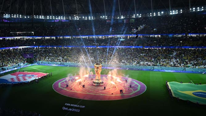 Fireworks go off around a replica of the World Cup trophy before the start of the Qatar 2022 World Cup quarter-final football match.