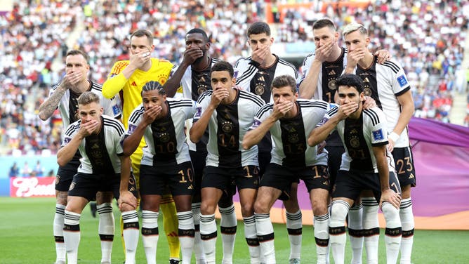 German players covered their mouths during the team photo before their Qatar 2022 World Cup opener against Japan to protest FIFA’s ban on wearing the "One Love" anti-discrimination armband.
