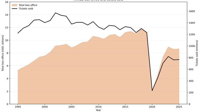 Tracking site The Numbers pulled together box office data from 2000-2025, comparing it with ticket prices, to estimate the total number of tickets sold in the US and Canada.