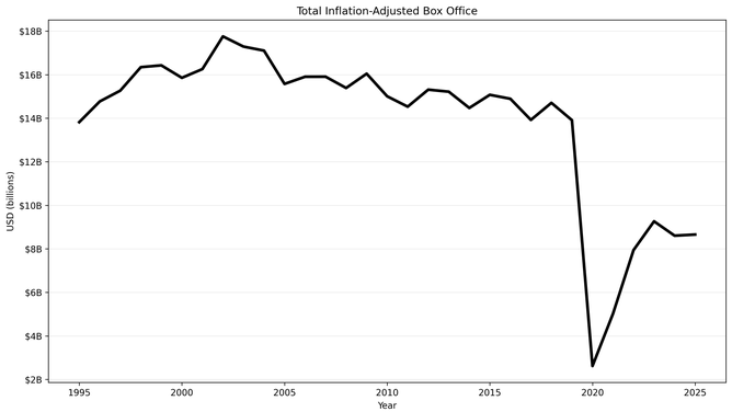The total box office for the industry has fallen substantially from its highs in 2019, but ticket sales are in an even bigger crisis, dropping to just over 760 million from a high of nearly 1.6 billion in 2002. That represents a decline of 51.3 percent in ticket sales from the 2002 peak to 2025. That's a crisis, and there's no sign of recovery.