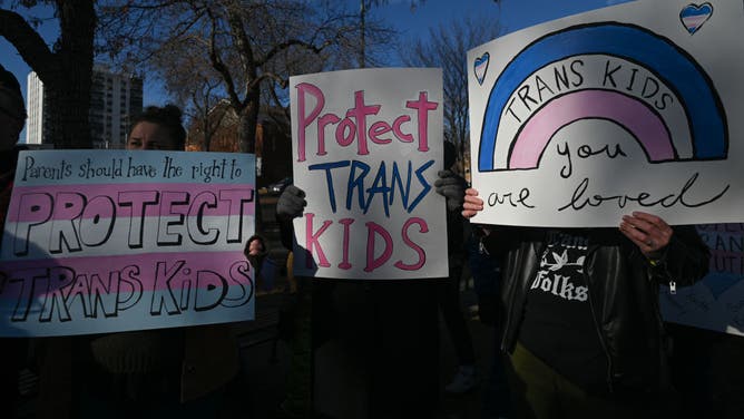 Transgender activists hold posters supporting "gender-affirming" treatments for children.