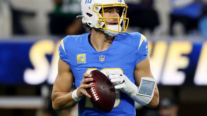 INGLEWOOD, CALIFORNIA - DECEMBER 08: Justin Herbert #10 of the Los Angeles Chargers looks to pass against the Philadelphia Eaglesat during the first quarter at SoFi Stadium on December 08, 2025 in Inglewood, California. (Photo by Katelyn Mulcahy/Getty Images)