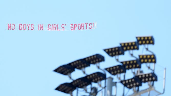A plane tows a sign that reads No Boys in Girls Sports in protest to transgender athlete AB Hernandez of Jurupa Valley during the CIF State Track and Field Championships.