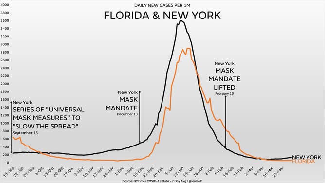 It's absolutely mind-boggling watching this revisionist history play out in the media yet again. New York, New Jersey and other anti-science states saw explosive case growth with mask mandates and other restrictions in the earlier part of the pandemic, when testing was nonexistent. We have no idea what the actual infection rate was in those states at that time period. We have no idea what true infection rates were later on.