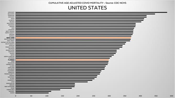 Instead, Fauci-following COVID extremist states like New York and New Jersey had far, far worse age-adjusted COVID mortality rates than Florida, where Ron DeSantis took the exact opposite approach.