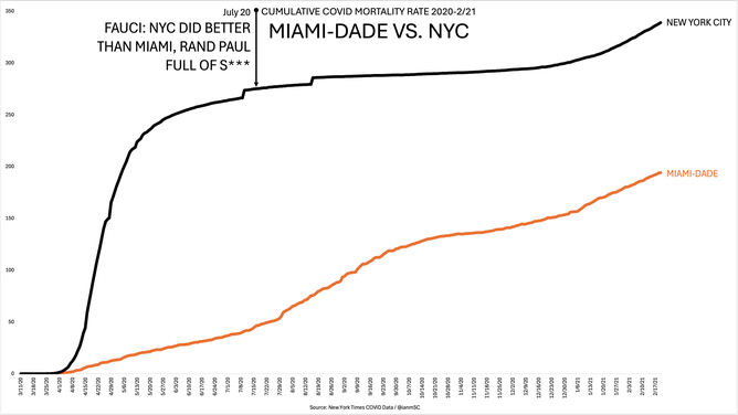 For the record, New York City's mortality rate was significantly higher than Miami-Dade for the entirety of the pandemic. Miami never caught up, despite Fauci's criticisms of Florida policy and praise for New York.