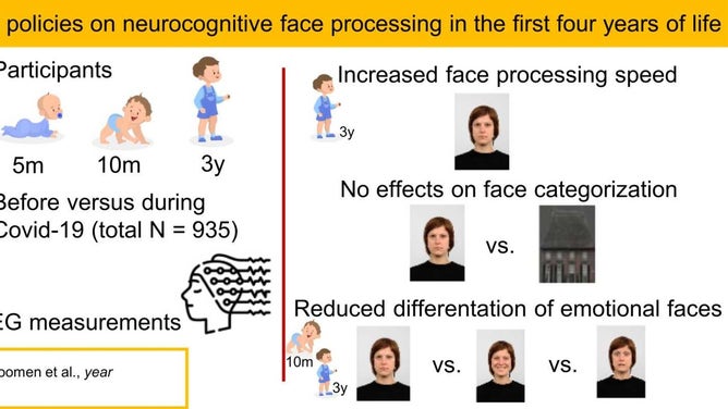 "Indeed, studies reveal that the development of facial information extraction requires experience with faces," the study says. "This experience is acquired during social interactions. However, children’s social interactions changed tremendously due to the governmental policies taken in response to the Covid-19 pandemic. For instance, due to day-care closing and social distancing in Western countries, children likely had more interactions with immediate family members, but reduced contact with other individuals. Moreover, children’s exposure to adult social interactions in various contexts likely decreased as well. Finally, adults started wearing facemasks covering the nose and mouth, thereby diminishing the input from parts of the face. Overall, pandemic-related alterations in social interactions are expected to lead to a lower variety of facial stimuli input, hypothesized to result in changes in the development of face processing."