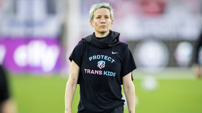 Megan Rapinoe wears a shirt that says "Protect Trans Kids" while she walks back to the locker room before the 2022 NWSL Challenge Cup Semifinal.