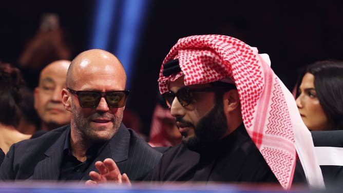 RIYADH, SAUDI ARABIA - DECEMBER 21: Actor and film producer Jason Statham and Turki Alalshikh, Chairman of the General Entertainment Authority, interact during the Super Welterweight fight between Serhii Bohachuk and Ishmael Davis as part of Oleksandr Usyk v Tyson Fury 2, Reignited card at Kingdom Arena on December 21, 2024 in Riyadh, Saudi Arabia. (Photo by Richard Pelham/Getty Images)