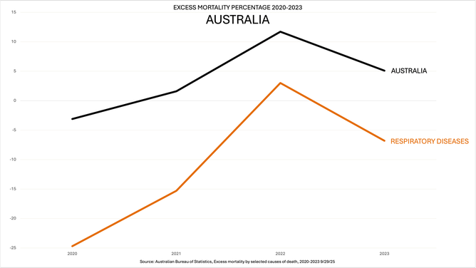 In some countries, like Australia, there was little to no excess mortality until late-2021, when they'd achieved widespread vaccination uptake. Excess deaths resulting from respiratory diseases actually increased at that point as well, reaching a pandemic high point in 2022.