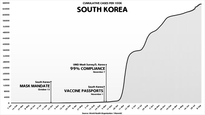 Which is why the most heavily masked countries on earth saw tremendous increases in infections, regardless of their level of compliance. South Korea, for example, has the highest confirmed cumulative COVID case rate on earth. One rolling survey from the University of Maryland conducted during the pandemic found that 99% of respondents had been wearing masks, a few short weeks before cases exploded to record highs.