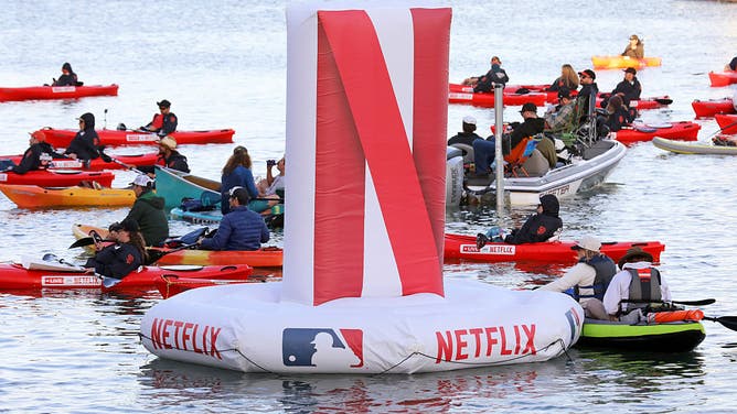Netflix branded floats, fans and kayakers on Netflix branded kayaks are seen during the MLB Opening Night Game: Yankees vs. Giants, at Momo's on March 25, 2026 in San Francisco, California. (Photo by Kelly Sullivan/Getty Images for Netflix)