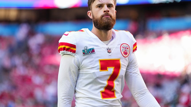 GLENDALE, AZ - FEBRUARY 12: Harrison Butker #7 of the Kansas City Chiefs warms up before the game against the Philadelphia Eagles prior to Super Bowl LVII at State Farm Stadium on February 12, 2023 in Glendale, Arizona. (Photo by Cooper Neill/Getty Images)