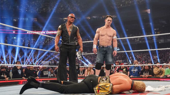 TORONTO, CANADA - MARCH 1: Dwayne "The Rock" Johnson and John Cena stand over Cody Rhodes during WWE Elimination Chamber at Rogers Centre on March 1, 2025 in Toronto, Canada. (Photo by Rich Freeda/WWE via Getty Images)
