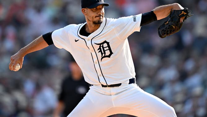 Aug 9, 2025; Detroit, Michigan, USA; Detroit Tigers starting pitcher Charlie Morton (50) throws a pitch against the Los Angeles Angels in the first inning at Comerica Park. Mandatory Credit: Lon Horwedel-Imagn Images