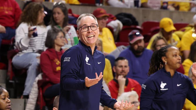 Jan 11, 2026; Ames, Iowa, USA; West Virginia Mountaineers head coach Mark Kellogg watches his team play the Iowa State Cyclones during the first half at James H. Hilton Coliseum. Mandatory Credit: Reese Strickland-Imagn Images