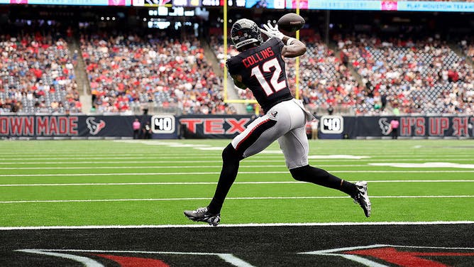 Nico Collins of the Houston Texans catches a touchdown pass during the first quarter in the NFL Preseason 2025 game between Carolina Panthers and Houston Texans at NRG Stadium on August 16, 2025 in Houston, Texas. (Photo by Alex Slitz/Getty Images)