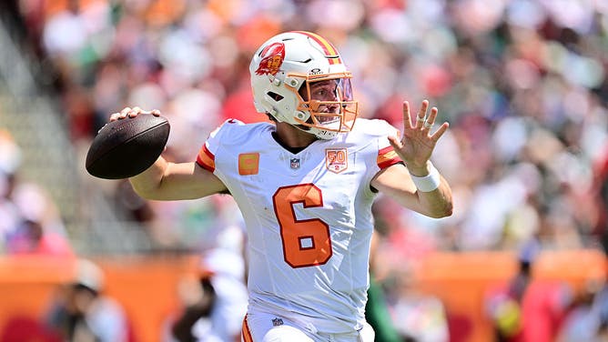 Baker Mayfield of the Tampa Bay Buccaneers looks to pass during the second quarter against the New York Jets at Raymond James Stadium on September 21, 2025 in Tampa, Florida. (Photo by Julio Aguilar/Getty Images)