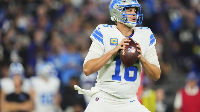 BALTIMORE, MD - SEPTEMBER 22: Jared Goff #16 of the Detroit Lions drops back to pass against the Baltimore Ravens during the first half of an NFL football game at M&T Bank Stadium on September 22, 2025 in Baltimore, Maryland. (Photo by Cooper Neill/Getty Images)