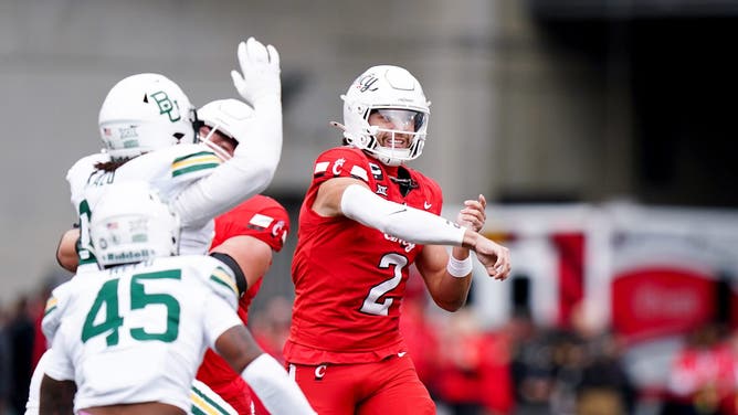 Cincinnati Bearcats quarterback Brendan Sorsby (2) throws a pass in the first quarter of a NCAA men’s football game between the Cincinnati Bearcats and Baylor Bears, Saturday, Oct. 25, 2025, at Nippert Stadium in Cincinnati.