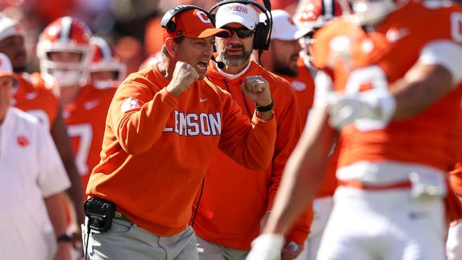 CLEMSON, SOUTH CAROLINA - NOVEMBER 1: Dabo Swinney of the Clemson Tigers reacts to a play during the first half against the Duke Blue Devils at Memorial Stadium on November 1, 2025 in Clemson, South Carolina. (Photo by Cory Knowlton/ISI Photos/ISI Photos via Getty Images)