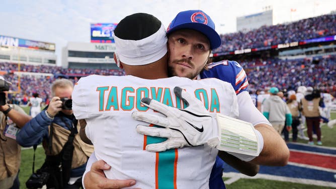 ORCHARD PARK, NY - Tua Tagovailoa of the Miami Dolphins and Josh Allen of the Buffalo Bills embrace on the field after their game at Highmark Stadium on November 3, 2024. (Photo by Bryan M. Bennett/Getty Images)