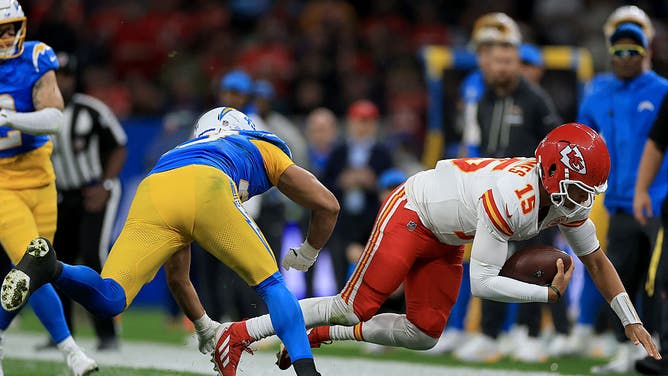 SAO PAULO, BRAZIL - Patrick Mahomesof the Kansas City Chiefs is pushed out of bounds by the Los Angeles Chargers defense during the game at Arena Corinthians on September 5, 2025. (Photo by Buda Mendes/Getty Images)
