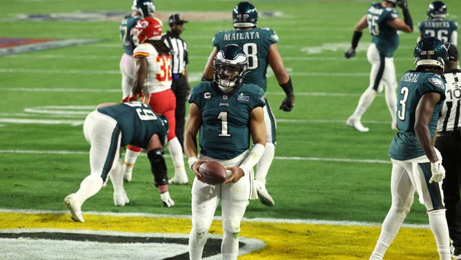 GLENDALE, ARIZONA - FEBRUARY 12: Jalen Hurts #1 of the Philadelphia Eagles celebrates after running for a two yard touchdown during the fourth quarter against the Kansas City Chiefs in Super Bowl LVII at State Farm Stadium on February 12, 2023 in Glendale, Arizona. (Photo by Ezra Shaw/Getty Images)