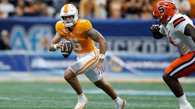 ATLANTA, GA - AUGUST 30: Joey Aguilar #6 of the Tennessee Volunteers looks to pass the ball during the AFLAC Kickoff Game against the Syracuse Orange on August 30, 2025 at Mercedes-Benz Stadium in Atlanta, Georgia. (Photo by Joe Robbins/Icon Sportswire via Getty Images)