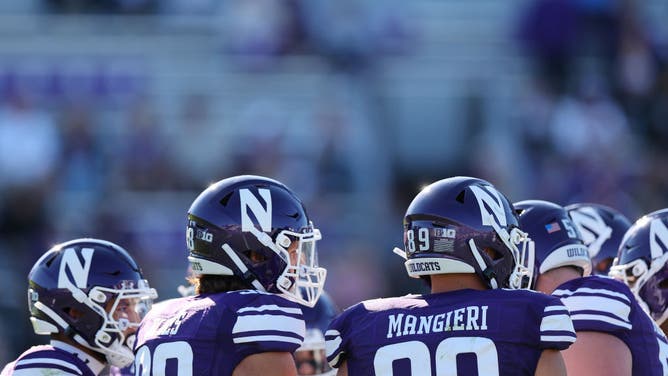 EVANSTON, ILLINOIS - SEPTEMBER 09: A detail of Northwestern Wildcats helmets against the UTEP Miners during the second half at Ryan Field on September 09, 2023 in Evanston, Illinois. (Photo by Michael Reaves/Getty Images)