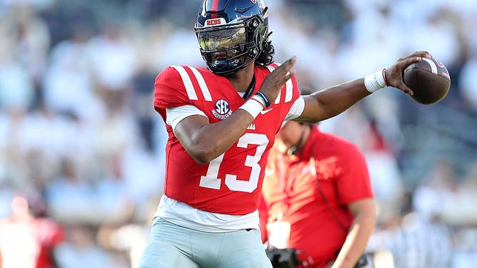 OXFORD, MISSISSIPPI - AUGUST 30: Austin Simmons #13 of the Mississippi Rebels warms up before the game against the Georgia State Panthers at Vaught-Hemingway Stadium on August 30, 2025 in Oxford, Mississippi. (Photo by Justin Ford/Getty Images)