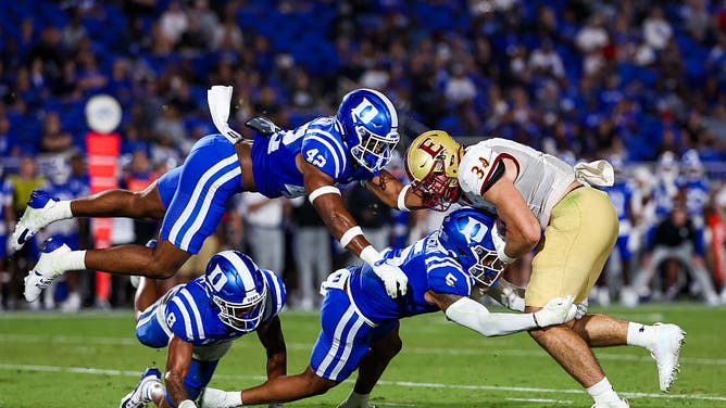 DURHAM, N.C. - Kendall Johnson #42, DaShawn Stone #8 and Kimari Robinson #5 of the Duke Blue Devils attempt to tackle Dylan Magazu #34 of the Elon Phoenix during the second half at Wallace Wade Stadium on August 28, 2025 in Durham, North Carolina. (Photo by David Jensen/Getty Images)