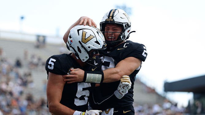 NASHVILLE - Vanderbilt Commodores quarterback Diego Pavia celebrates with Vanderbilt Commodores wide receiver Richie Hoskins (5) after connecting for a touchdown during a game between the Vanderbilt Commodores and Utah State Aggies, September 27, 2025, at FirstBank Stadium. (Photo by Matthew Maxey/Icon Sportswire via Getty Images)