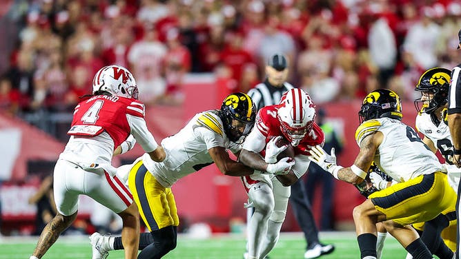 MADISON, Wis. - Wisconsin running back Dilin Jones tries to gain extra yards during a college football game between the University of Wisconsin Badgers and the University of Iowa Hawkeyes on October 11, 2025, at Camp Randall Stadium. (Photo by Lawrence Iles/Icon Sportswire via Getty Images)