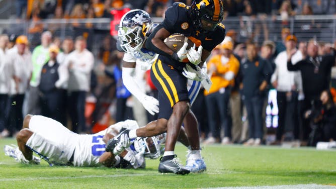 KNOXVILLE, Tenn. - Dylan Sampson #6 of the Tennessee Volunteers breaks a tackle and scores a touchdown during the second half of the game against the Kentucky Wildcats at Neyland Stadium on November 2, 2024. (Photo by Johnnie Izquierdo/Getty Images)