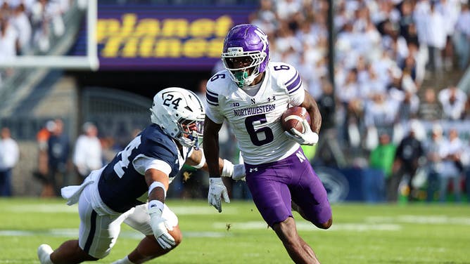 STATE COLLEGE, Pa. - Joseph Himon II of the Northwestern Wildcats runs the ball against Corey Smith of the Penn State Nittany Lions at Beaver Stadium on October 11, 2025. (Photo by Isaiah Vazquez/Getty Images)