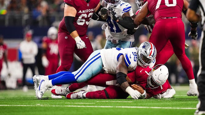 ARLINGTON, TEXAS - NOVEMBER 03: Jacoby Brissett #7 of the Arizona Cardinals is sacked by Kenny Clark #95 of the Dallas Cowboys during an NFL football game at AT&T Stadium on November 3, 2025 in Arlington, Texas. (Photo by Perry Knotts/Getty Images)