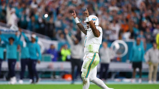 MIAMI GARDENS, FLORIDA - JANUARY 07: Tua Tagovailoa #1 of the Miami Dolphins reacts after a touchdown during the second quarter against the Buffalo Bills at Hard Rock Stadium on January 07, 2024 in Miami Gardens, Florida. (Photo by Megan Briggs/Getty Images)