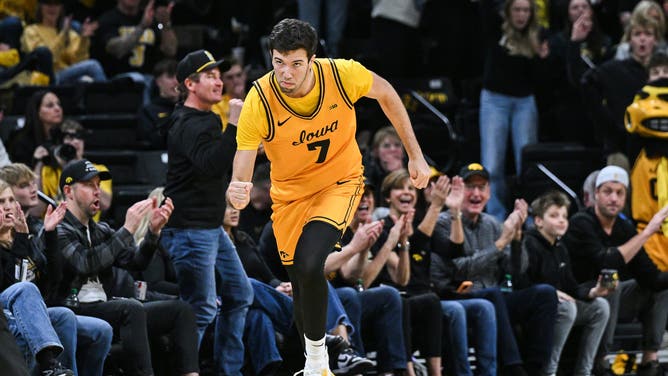 Dec 6, 2025; Iowa City, Iowa, USA; Iowa Hawkeyes forward Alvaro Folgueiras (7) reacts after a three-point basket against the Maryland Terrapins during the first half at Carver-Hawkeye Arena. Mandatory Credit: Jeffrey Becker-Imagn Images