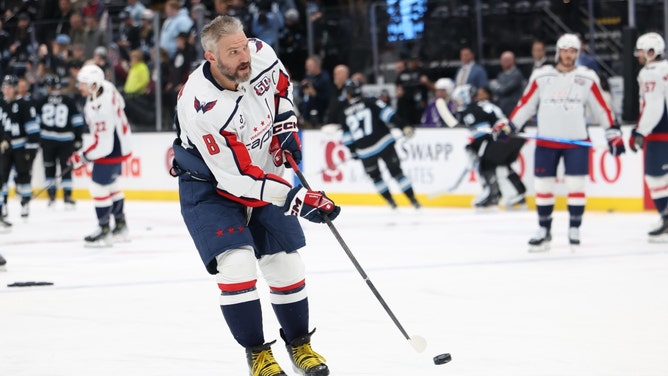 Nov 18, 2024; Salt Lake City, Utah, USA; Washington Capitals left wing Alex Ovechkin (8) warms up before a game against the against the Utah Hockey Club at Delta Center. (Rob Gray-Imagn Images)